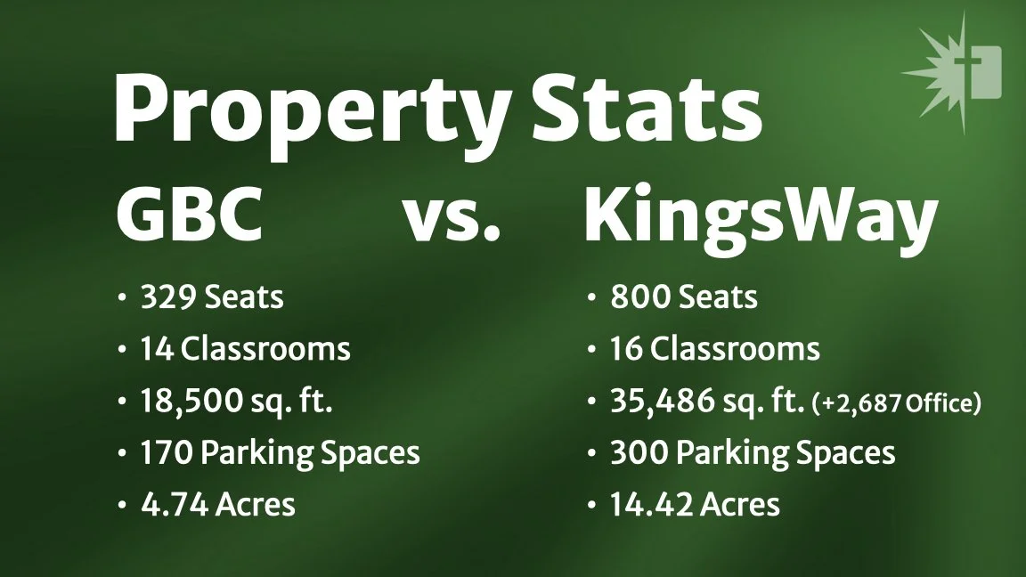 God appears to be expanding/growing our church body in significant ways, but especially numerically. We believe the KW facility would better allow us to continue to make more disciples for Jesus Christ. If the property is used the way we envision, the eternal impact on not only the people the Lord has already sent to us, but also to those He may sovereignly choose to send our way, could be spiritual fruit that none of us can really see at present. Our zip code is growing and people are looking for a place to worship that teaches and preaches God's word. The future is coming fast and it would be wise for us to anticipate that reality.